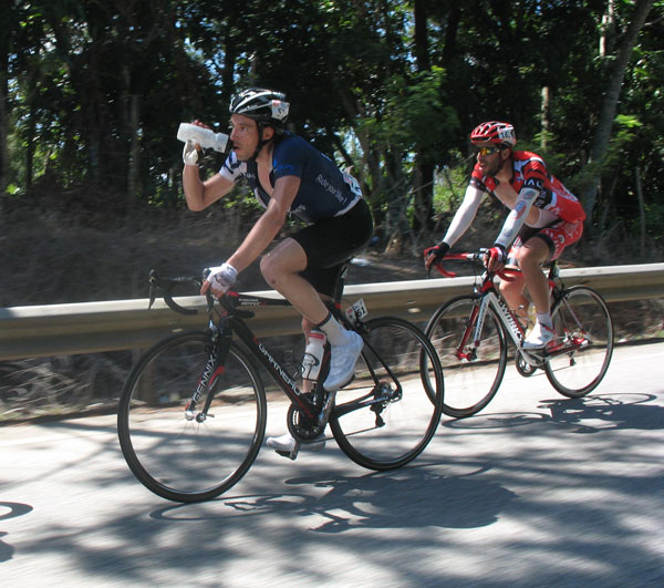 Finalement l'inévitable montée arrive, la première est un vrai casse-pattes. Environ 2 km entre 15 et 20% de pente, c'est comme la côte Gilmour mais on voit pas la fin... On s'accroche et on chasse dans la descente, je fais une sortie de route dans un virage et je me retrouve dans le salon d'un dominicain... Demi-tour, puis retour sur la route après une bonne peur. La deuxième montée aura raison de moi (et de pas mal de gars), 8km de montée incessente. On se retrouve donc dans un bon groupe de sprinter, de porteur d'eau et de gars complètement démolit. Finalement je pourrai franchir la ligne dans les llimites accordés mais l'effort aura tout de même été important, pas moyen de s'en sortir!