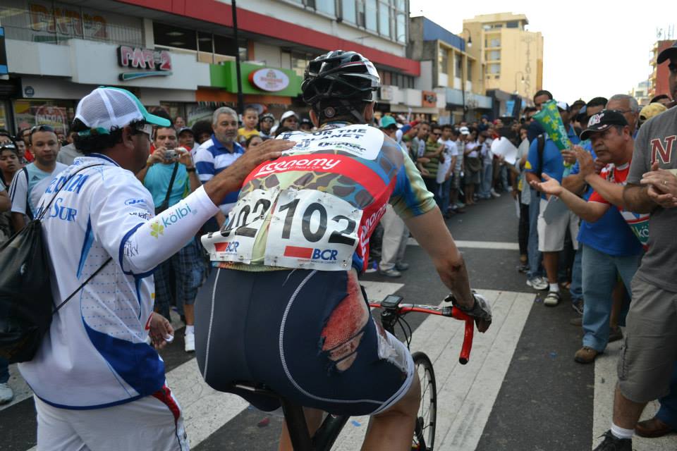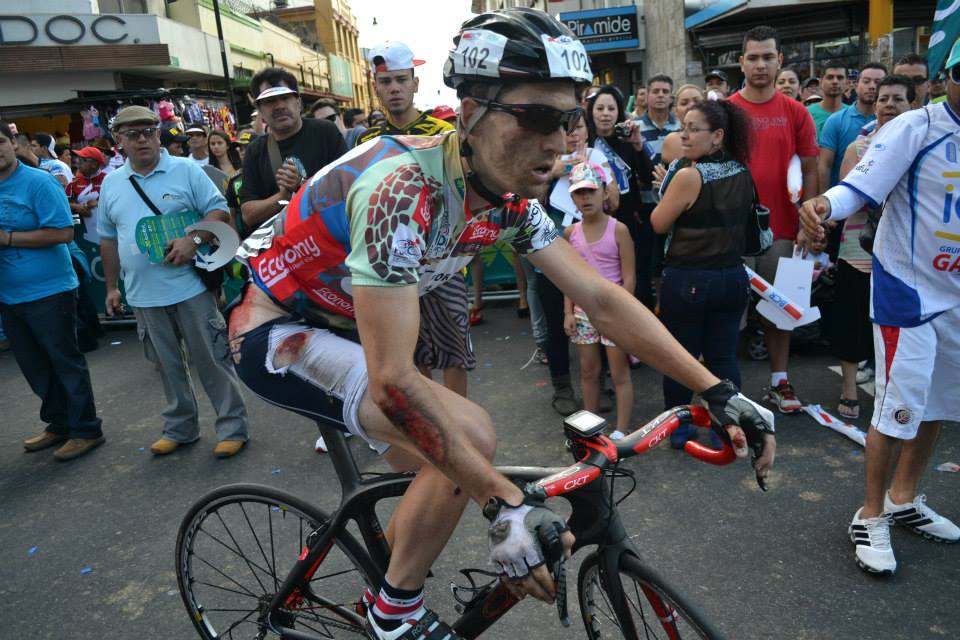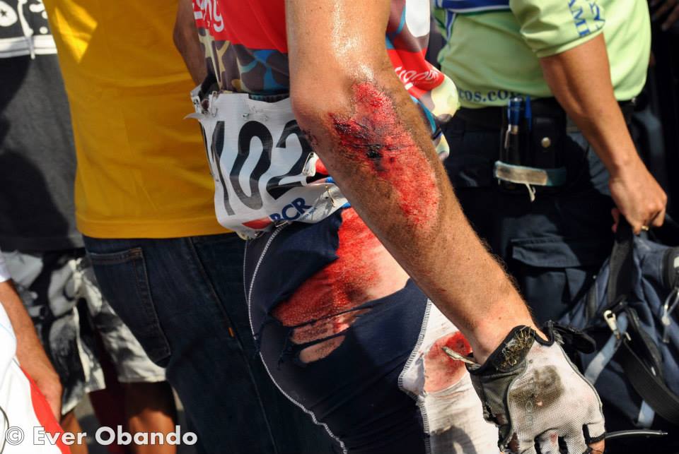 Jean-Michel: "With the neutral bike, I was not as confortable and so I stayed last of the group in the descent. The crash happen very fast, I hear a rubbing noise comming from the Pizza Hut rider about 10m in front of me on my left. He then do a front flip. At that moment, I still tought I had a chance to get through fine but his bike went airborn in my direction. I then crashed pretty hard. At first, the pain was violent and I tought I had broken something, but a few minutes later, it went away and I asked for my bike to finish the race. The injuries were painfull but luckily, the rest of the stage was mostly descending and with thousands of spectators cheering in the last kilometers, it adds up to the motivation. When I reach the finish line, I was immediately attend by the first aid to clean the cuts and put ice on my eye. Later in the day, I received literally hundreds of support messages from Costa Rican who were impressed by my finish. I feel very touched by the support and thank the Costa Rican people for loving cycling so much. This year, I had the opportunity to do a big road block, which I had never done in my life before and I enjoyed the best form of my life during those 2 weeks of racing, so this is a great motivation for 2014."